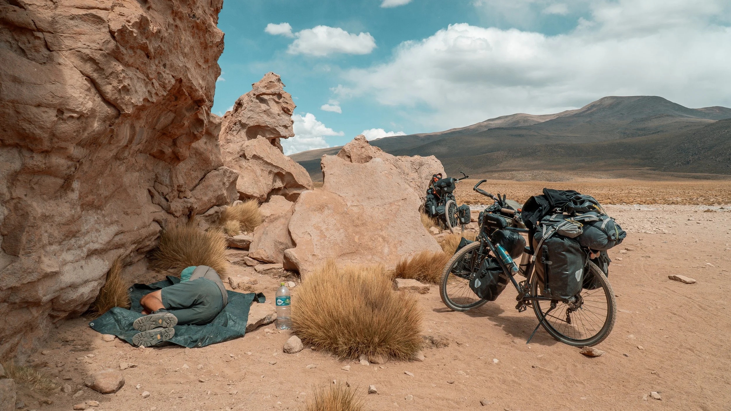 An Tag drei jedoch wechselt der Untergrund: Zunächst geht es auf befestigten Schotter, und bereits gegen Ende des Tages fahren wir durch Sand. Das macht das Fahren natürlich deutlich anstrengender, und die erbarmungslose Sonne auf über 4000 Metern Höhe trägt ihr Übriges dazu bei. So legen wir uns am Nachmittag gerne mal zu einem kleinen Nickerchen unter einen schattenspendenden Felsen.