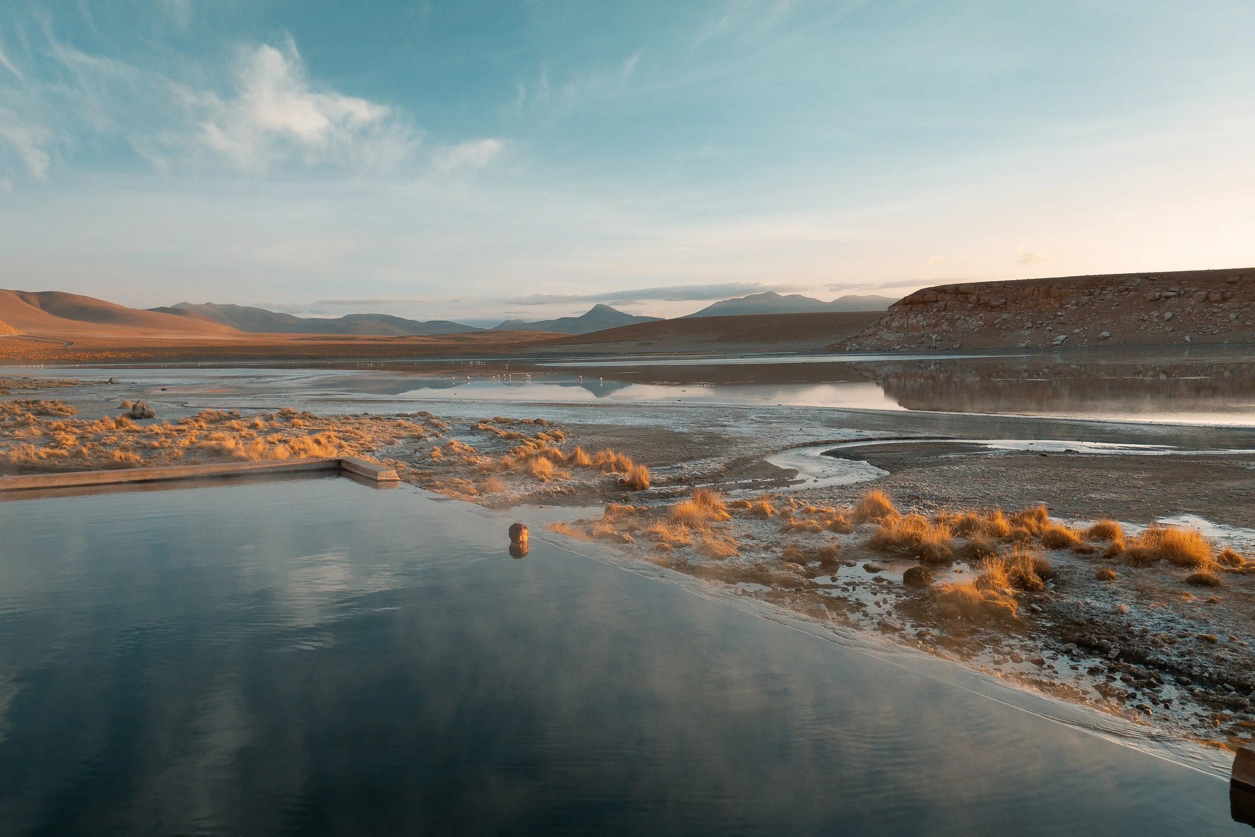 Irgendwann weicht der Sand wieder Schotter, welches das Ende unserer Route einläutet. Zum Abschluss kommen an einer besonderen Laguna vorbei – der Laguna Salada. Direkt am Rand der Lagune wird Heißwasser aus den Thermalquellen in Schwimmbecken geleitet, die wir vollkommen kostenlos und ohne eine weitere Menschenseele zu sehen, nutzen können. Das Wasser ist richtig schön warm, und man ist nur wenige Meter von den Flamingos entfernt. Nach so einer langen und anstrengenden Route natürlich eine absolute Wohltat. Das wollen wir so richtig ausnutzen und entscheiden uns, die Nacht hier zu verbringen, denn direkt nebenan befindet sich wieder eine kleine Ruine die uns vor dem Wind schützt.
